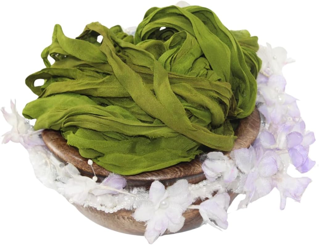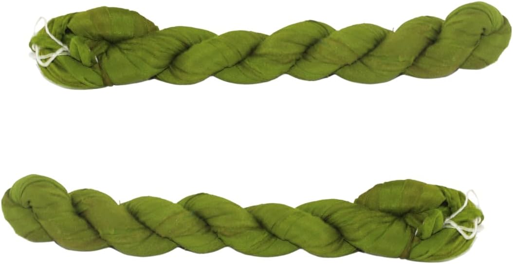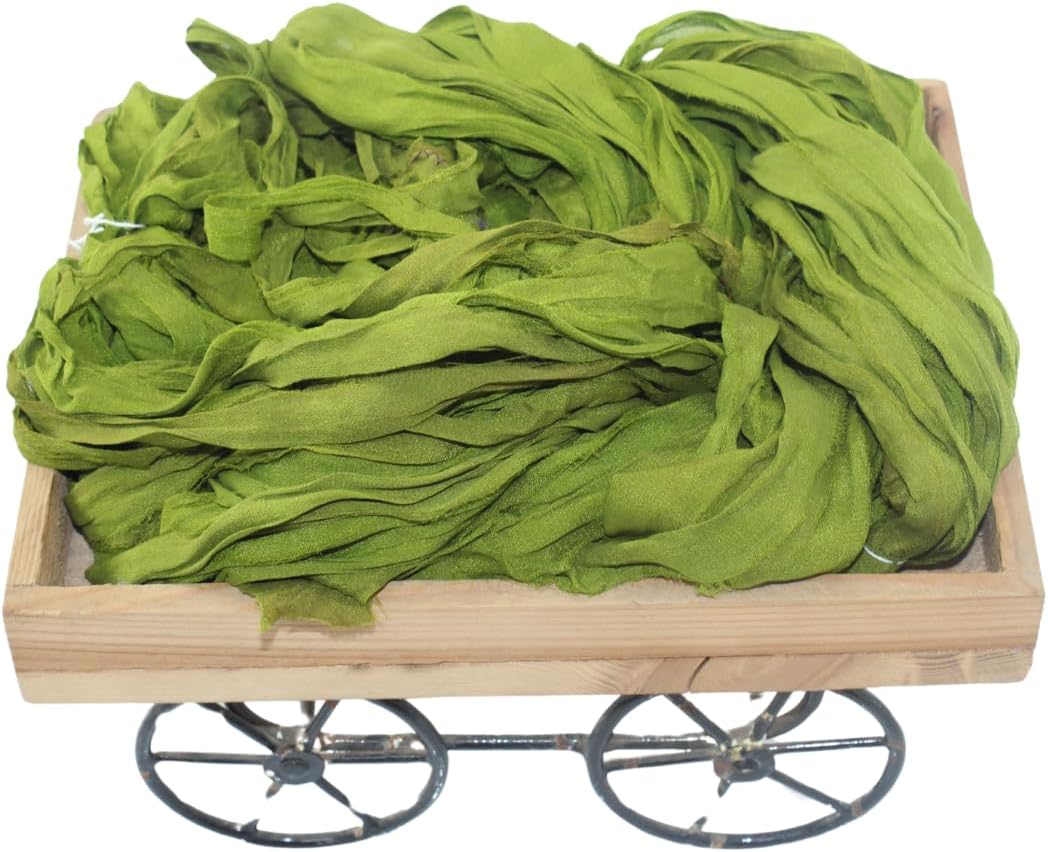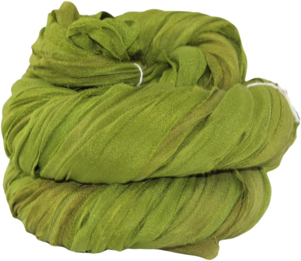 Recycled Sari Silk Ribbon Yarn -Super Bulky Olive Green Yarn |Best for Crochet, Knitting,Embroidery,and Jewelry Making |50 GMS-30 Yards|Sustainable and Unique Texture Ribbon Yarn (Pack of 1)