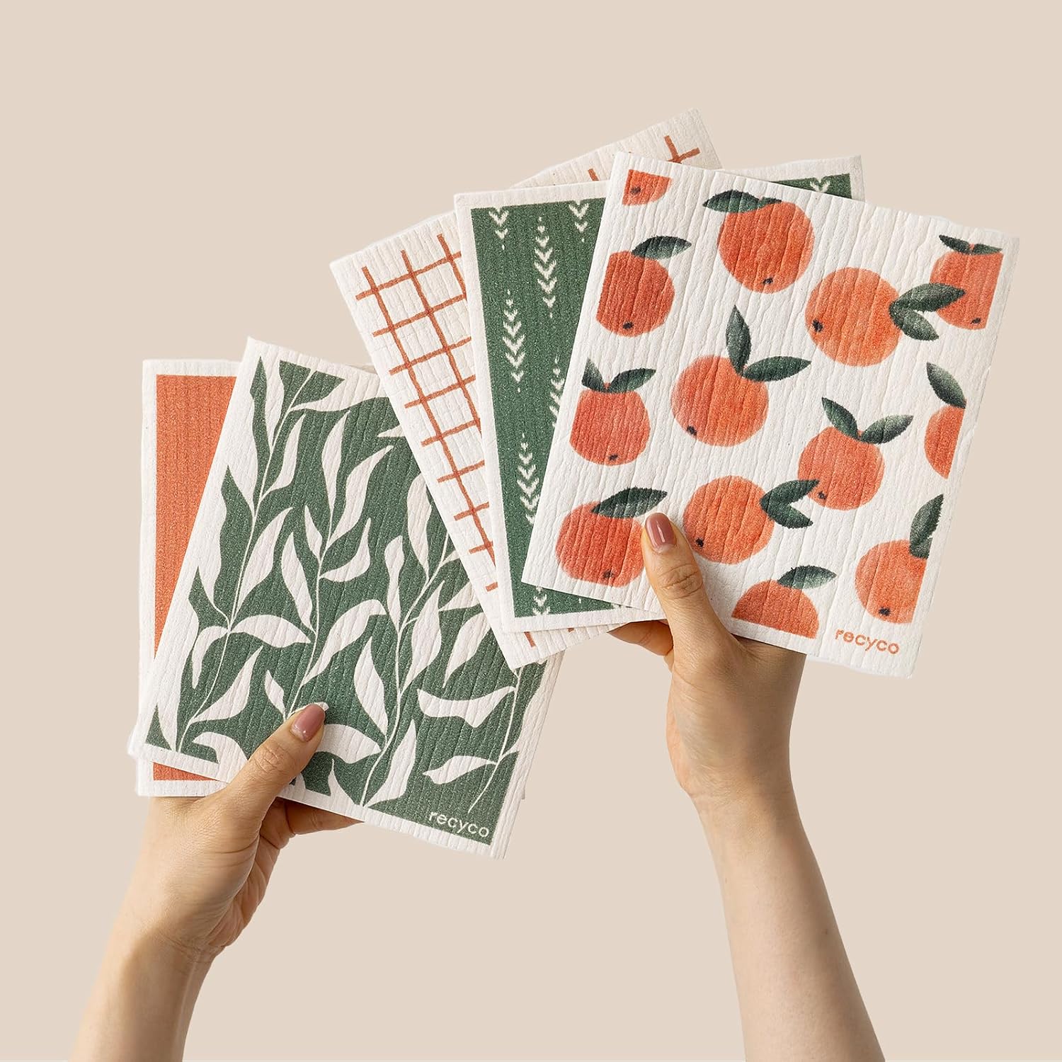 RECYCO Swedish Dishcloths for Kitchen | 5 Pack Peachy Leaves Washable Dish Rags | Cellulose Reusable Cleaning Paper Towels | Absorbent Counter Dish Cloth Sponge Kitchen Wipes, 8″ L x 7″ W
