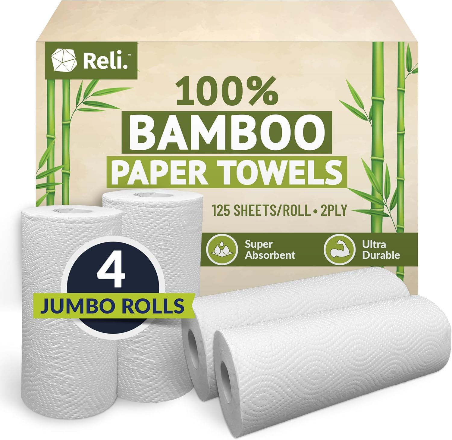 Reli. Bamboo Paper Towels (4 Pack, Jumbo) | Paper Towels Rolls 2 Ply | 125 Sheets/Roll, Full Size Sheets | Unbleached, Organic Rolls for Kitchen, Bathroom | 100% Bamboo