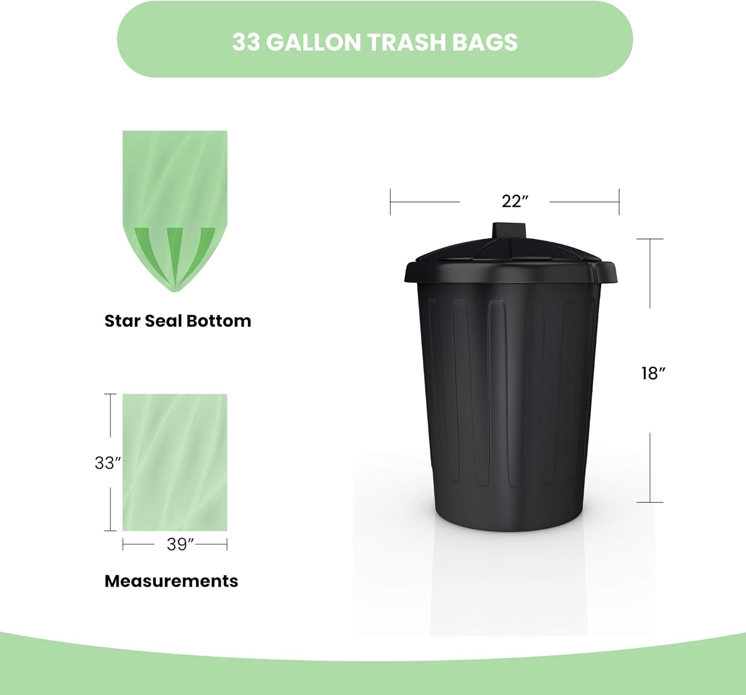 Premium Value: Large bag size (33″x 39″) with 33 gal eco friendly toughness(13 mic)