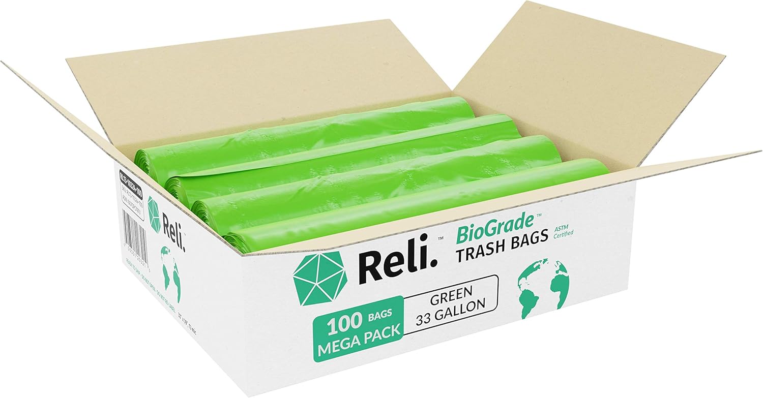 Reli. Biodegradable 33 Gallon Trash Bags, 100 Count, Green Eco Friendly, Degradable Under Certain Conditions, Custom-Fit for Compactor