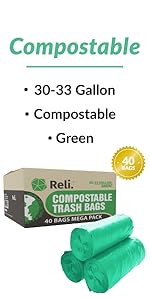 Reli. Compostable 33 Gallon Trash Bags | 40 Count | ASTM D6400 | Green | Eco-Friendly | For Compost