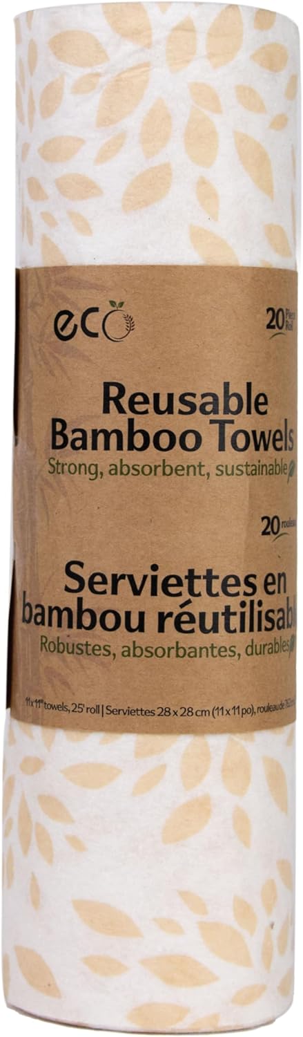 Reusable Bamboo Paper Towel Roll, 25 Feet, 20 Sheets, Machine Washable, White with Beige Leaf Pattern