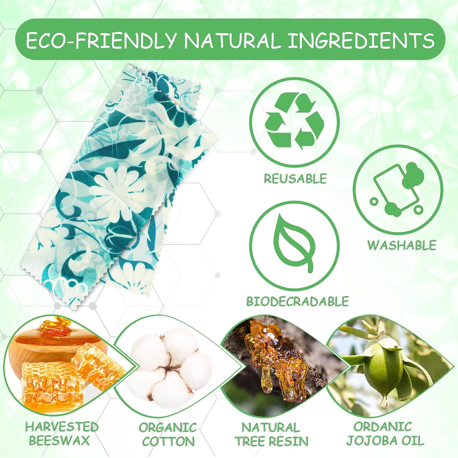 Natural Material Composition: Beeswax wrapping paper is made of organic cotton, organic jojoba oil, beeswax and resin, no other additives, with reusable properties, natural and environmentally friendly materials can keep your food longer and safer.