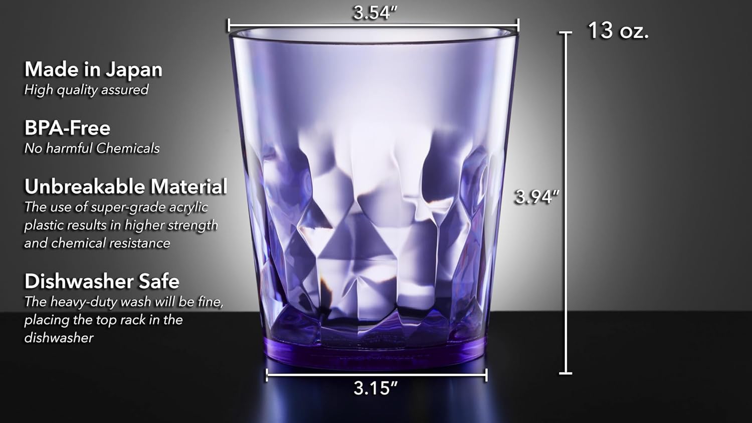 UNBREAKABLE ELEGANCE (MADE IN JAPAN) – Enjoy worry-free sipping with our stunning, crystal-clear drinking glasses. Designed to mimic real glass, these durable plastic glasses drinking elevate every occasion, indoors or outdoors. 3.54 in (Top) x 3.15 in (Bottom) x 3.94 in (Height), 100% Made in Japan, Super Grade Acrylic Plastic (BPA Free / Prop 65 compliant)