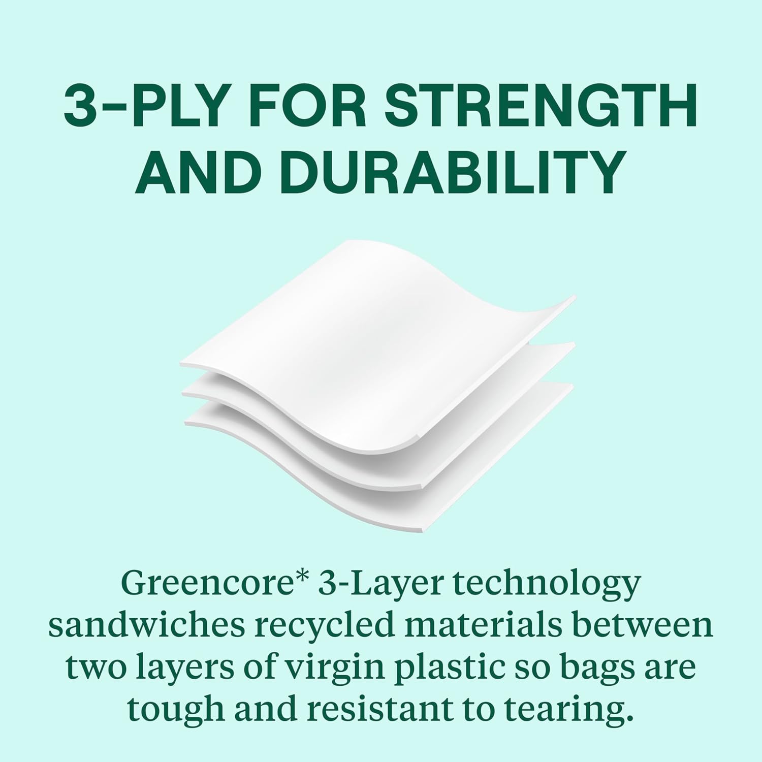 Seventh Generation Tall Kitchen Trash Bags are the sustainable and durable choice for your kitchen waste. Our trash bags are made with 55% recycled content making these trash bags a more sustainable choice than trash bags made from 100% virgin plastic. Each bag features our Gencore 3-layer technology making them tough and flexible maximizing your ability to fill each bag. These trash bags feature a convenient flap tie closure making clean-up easy! At Seventh Generation we do business differently. We believe our products are healthy solutions for use within your home–and for the community and environment outside of it. We are always evaluating how to reduce their environmental impact, increase performance and safety, and create a more sustainable supply chain. We believe it is our responsibility to set a course for a more mindful way of doing business, where companies act as partners with other stakeholders to create a brighter future for the whole planet. Seventh Generation is proud to be a Certified B Corporation. B Corps are certified to be better for workers, better for communities, and better for the environment. By choosing Seventh Generation products, you’re joining us in nurturing the health of the next seven generations.