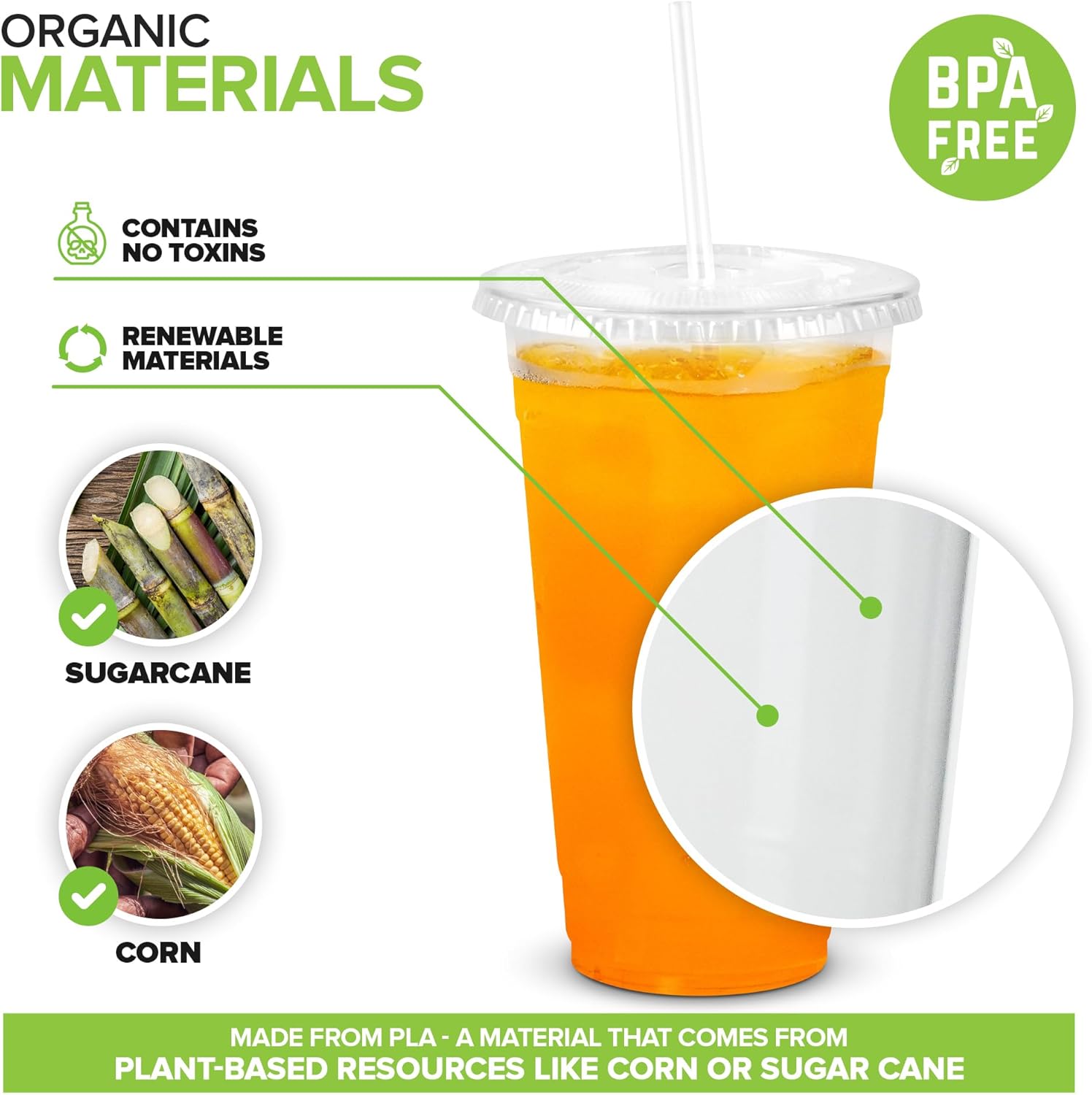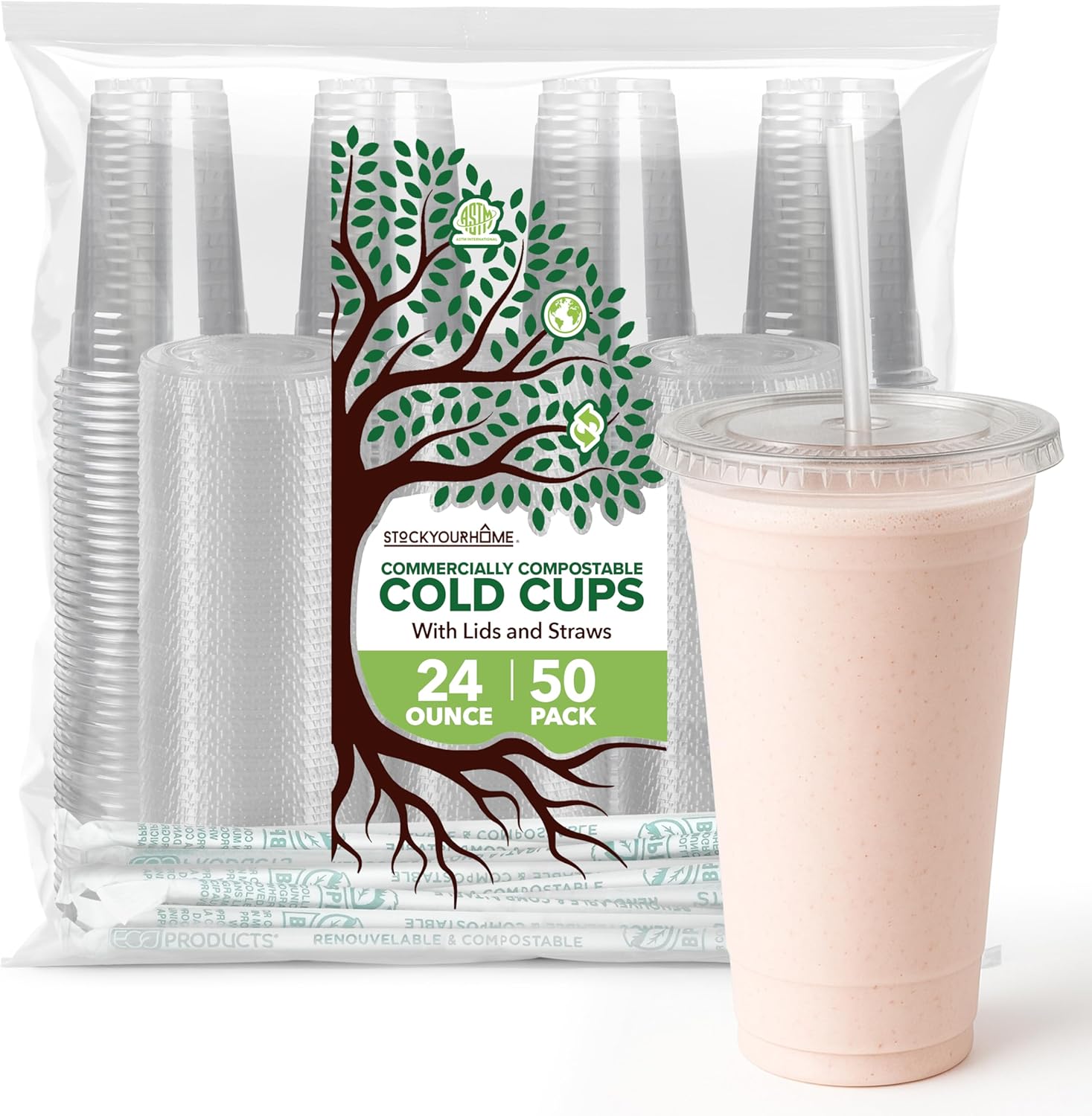Stock Your Home 24 oz Clear Commercially Compostable Cups with Lids and Straws (Set of 50) Plant Based Cold Cups, Eco Party Cup, Environmentally Friendly Recyclable Disposable Sustainable