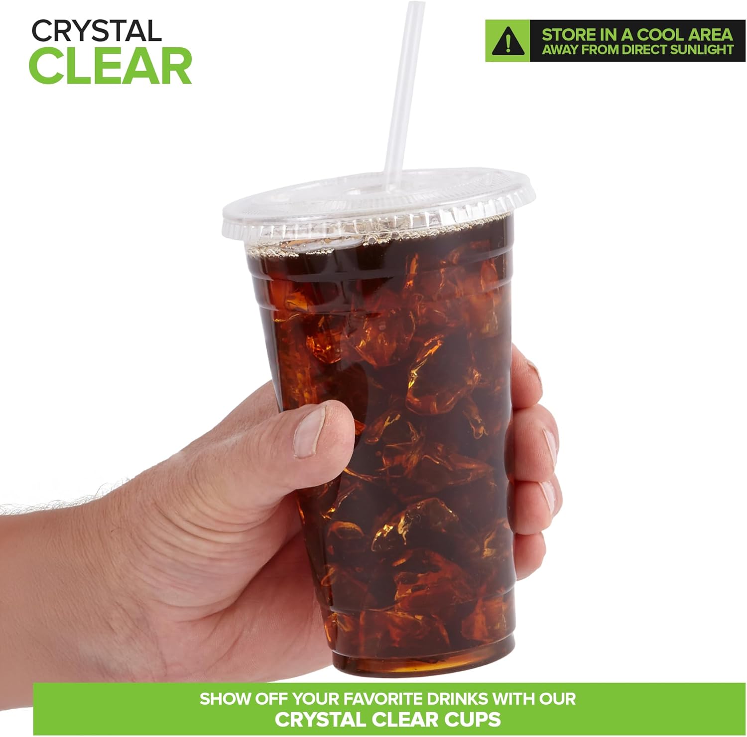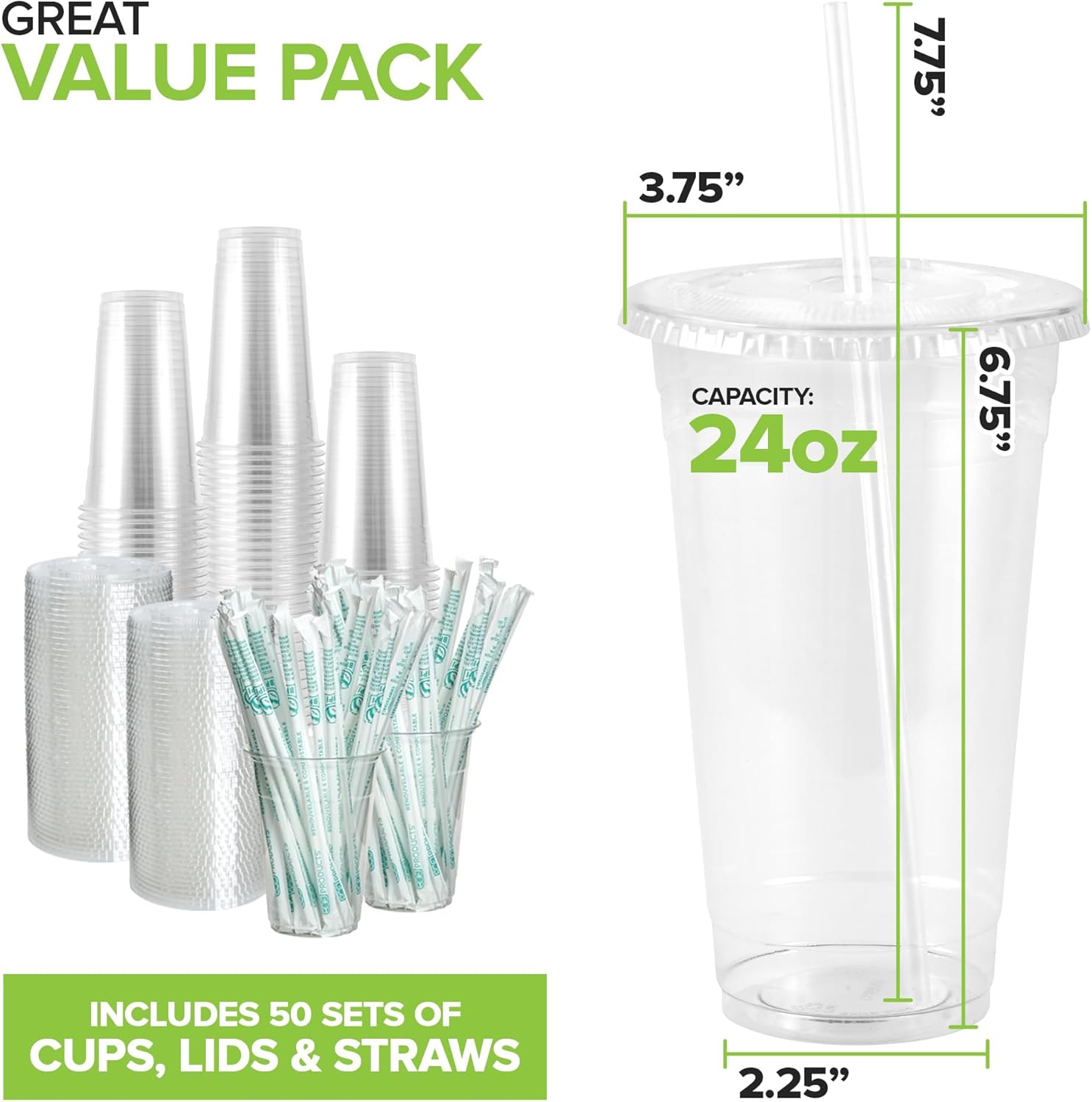 Great Value Pack: Includes 50 sets of 24 oz cold cups, lids and straws. Cup measures 3.75″DIA (top) x 6.75″H (cup only) x 2.25″DIA (bottom) x 7.75″H (straw) . *Store in a cool area, away from direct sunlight.
