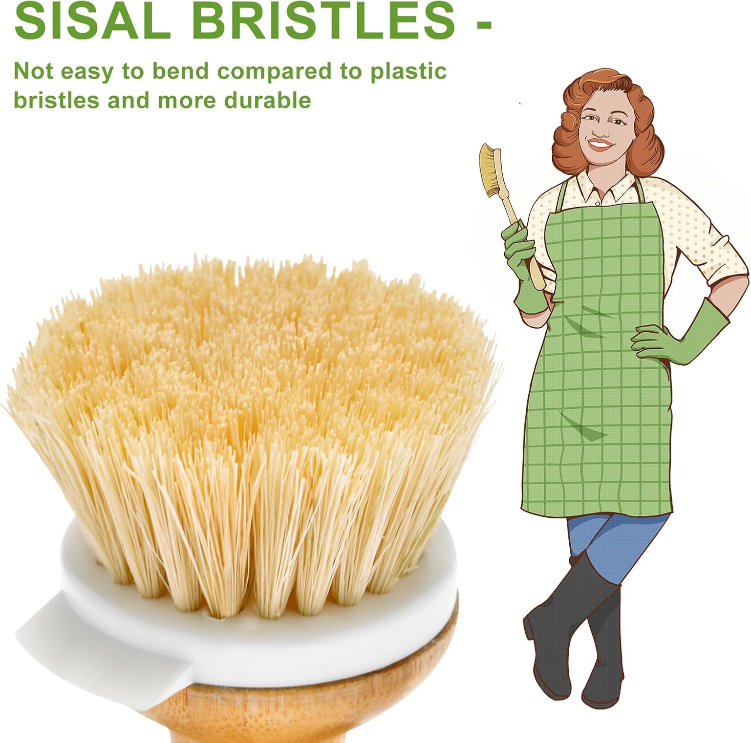 SUBEKYU Bamboo Dish Brush, Kitchen Dish Scrubber Brush with Soap Dispenser, Natural Wooden Dishwashing Brush for Cleaning Dishes/Pans/Pots, Built-in Scraper, Sisal Bristles,1 Set