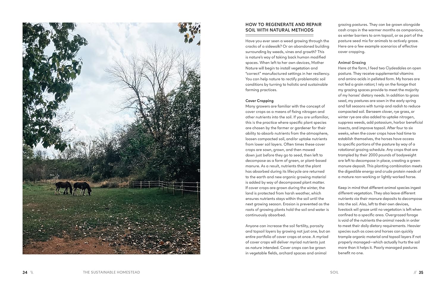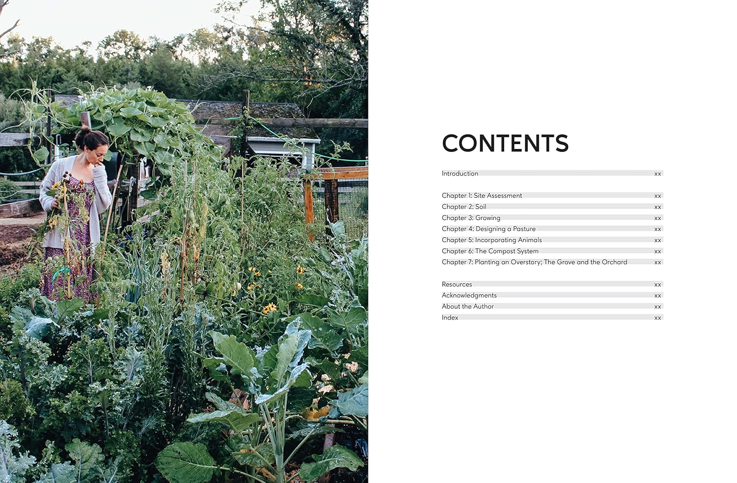 Site Selection: Evaluate the elements, water flow and management, wildlife considerations, effective layouts, land elevation, water access points, permaculture zones, considerations based on acreage, how to remedy site shortcomingsSoil: The importance of soil, symptoms of poor soil, synthetics, water and erosion, healthier crops and animals, how to regenerate soil, cover crops, no-till method, perennial plantingsGrowing: Catching and storing water with swales, catchment ponds, and rain barrels; sunlight and garden design including mandala, terrace, and forest; plant choices; companion planting; holistic pest management including cultural, physical, and biological optionsPasture: Design considerations, cover cropping, grazing, animal compatibility, pasture rotation, closed-loop grazing systems, maintenance, solar fencingAnimals: Chickens, ducks, geese, turkeys, and the sustainable coop; sheep, goats, pigs, and sustainable living quarters; horses, cows, donkeys, and sustainable stable; natural remedies; livestock guardian dogs and barn catsCompost: What is compost?, hot vs. cold, decomposition and carbon to nitrogen ratios, creating a composting system, tier considerations, access and rotation, uses of compost, compost teaOverstory: Nut trees and permaculture contributions, pollinator groups, fruiting trees, planting in guilds, pest management, tree health