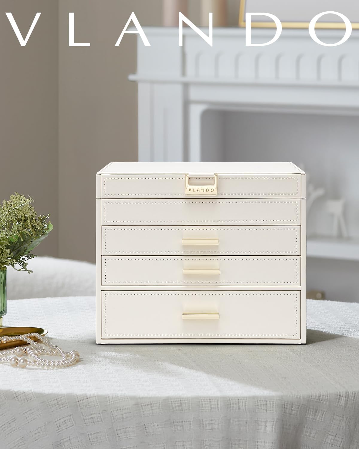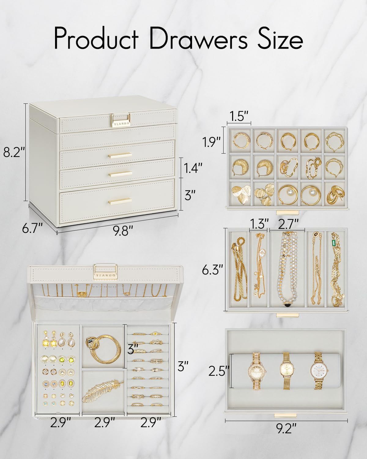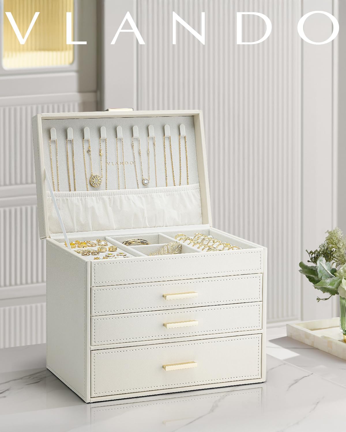 4 LAYERS OF LARGE CAPACITY- Vlando jewelry box has multifunctional storage compartment, drawer with 15 grids, 5 grids, for rings & ear studs, necklaces, bracelets, watches. It offers sufficient storage space for all your jewelry, and finally lets you store your jewelry properly.