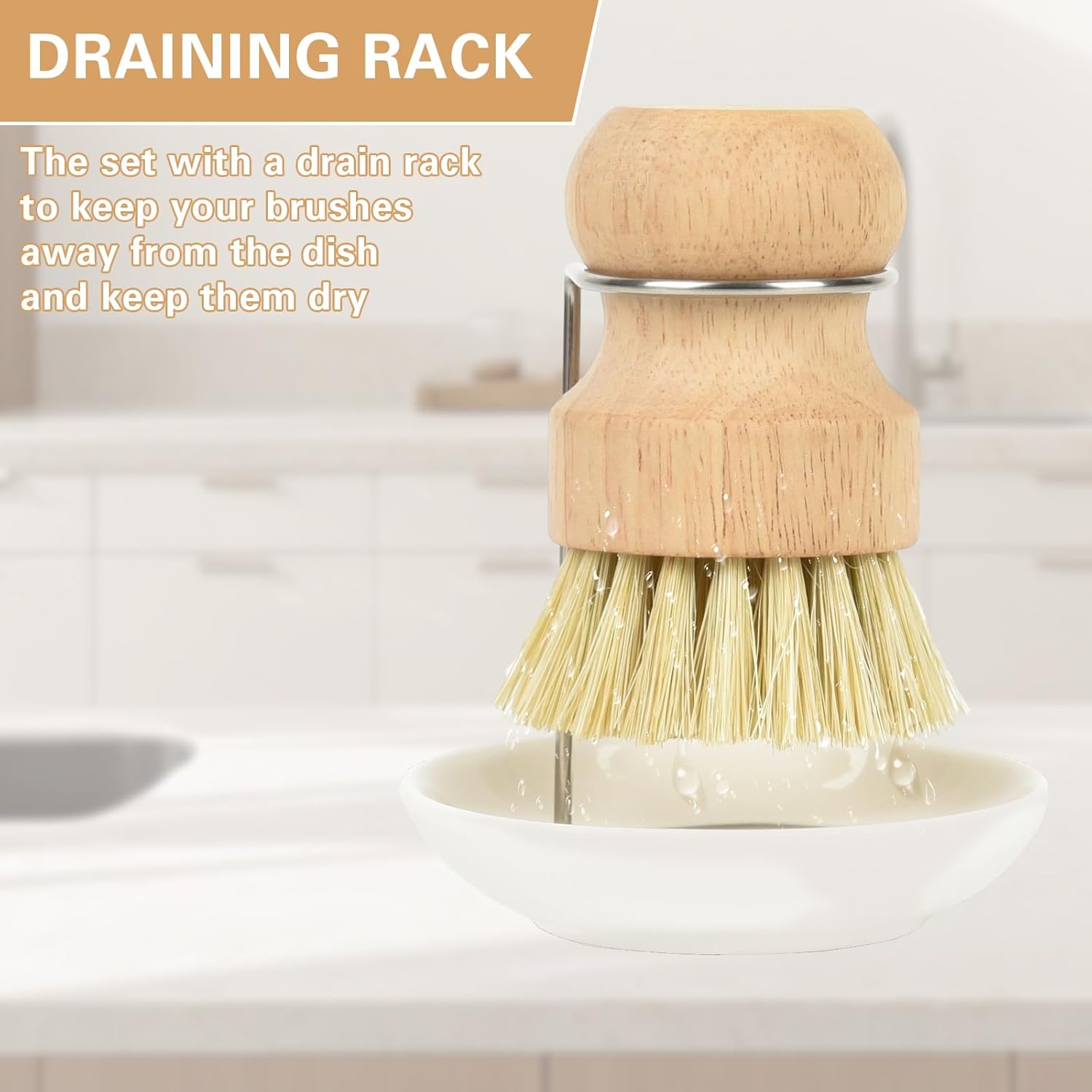 Perfect Set: The natural dish brush set comes with an additional drain rack and ceramic dish. After use, you can place the brush on the drain rack, and the water will drip into the ceramic dish, keeping the bottom of the brush dry better