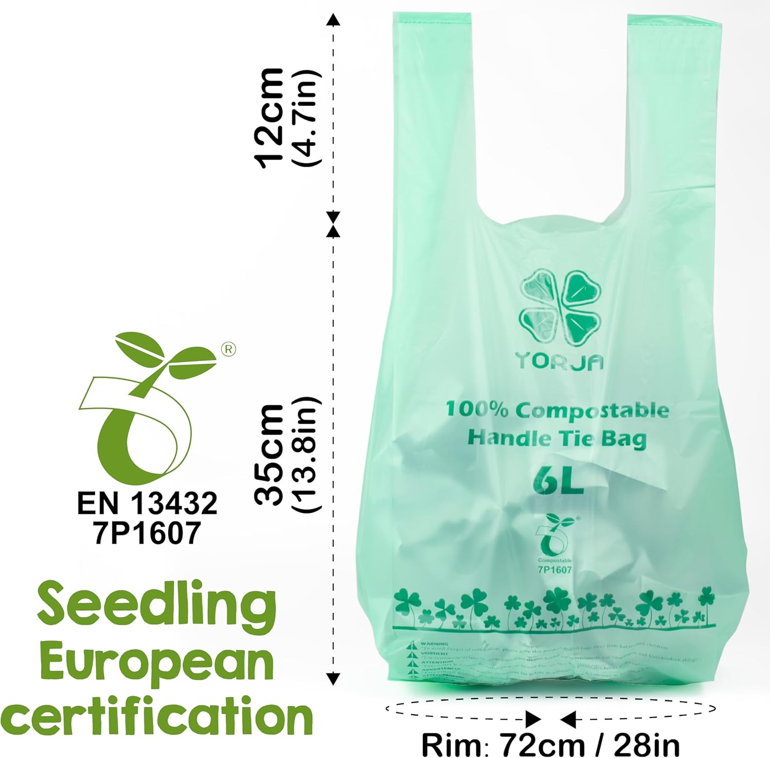 YORJA 1.6 Gallon Tie Handles Compost Trash Bags 120 Food Scrap Bags, Compostable Kitchen Waste Bags with Europe EN13432 & ASTM D6400 Certified
