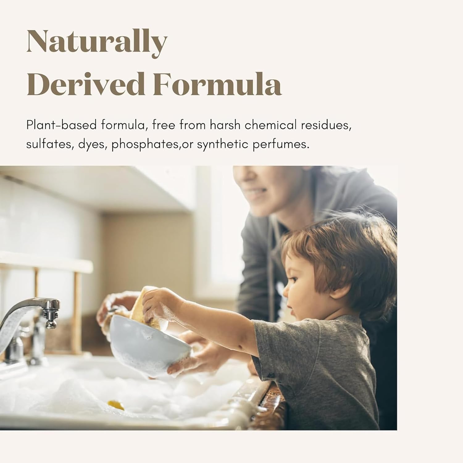 Naturally Derived Formula – The dish soap boasts a naturally derived, plant-based formula, free from harsh chemical residues, sulfates, dyes, phosphates, or synthetic perfumes, aligning with a clean lifestyle.